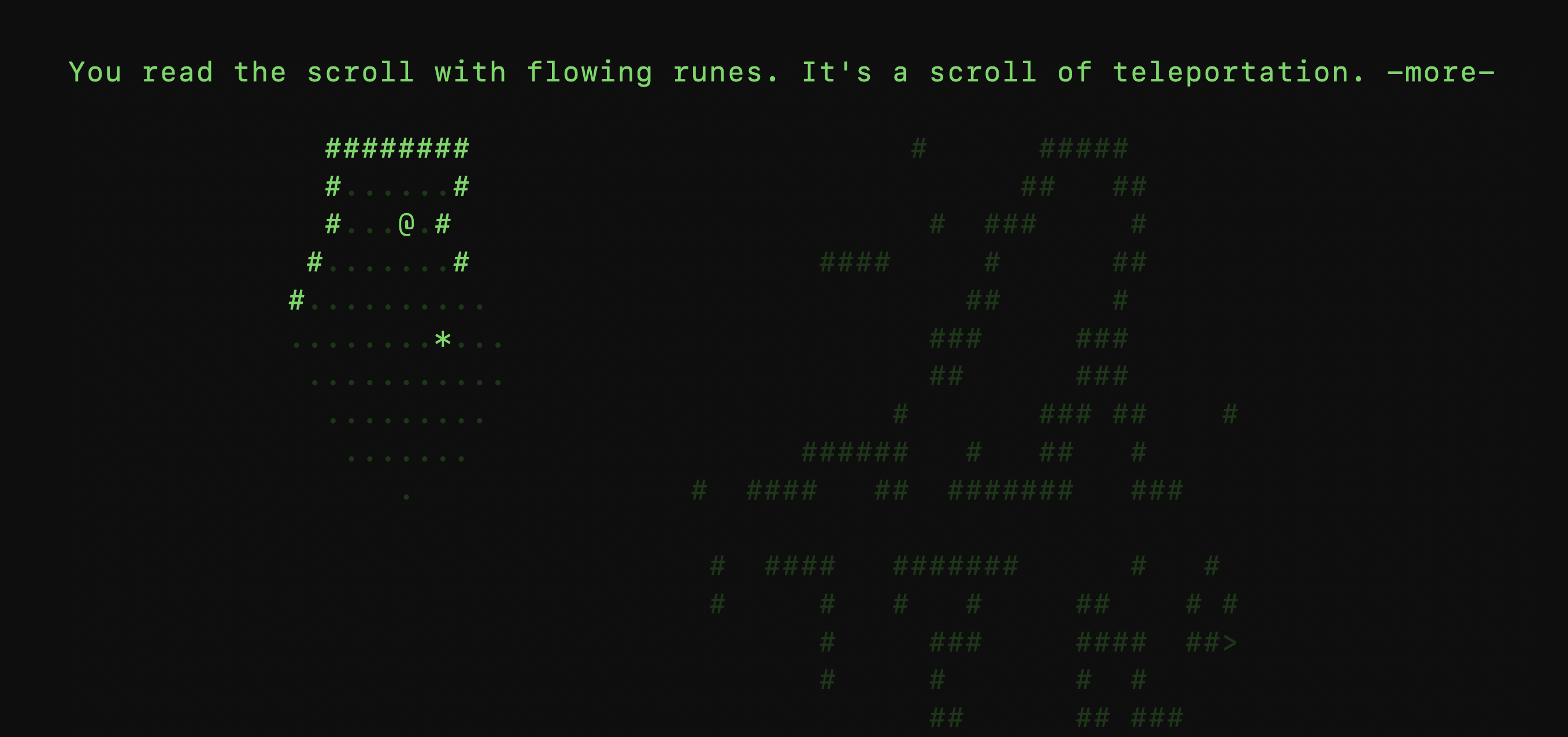 All scrolls of the same kind will have the same descriptor—in one game, all scrolls with flowing runes might be magic mapping and all scrolls with smudged runes might be monster confusion.